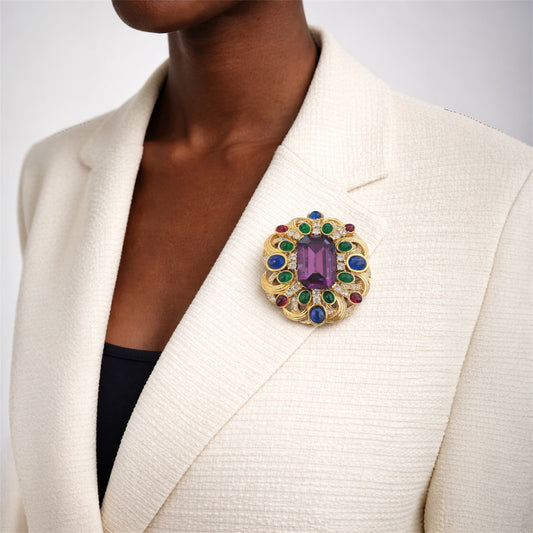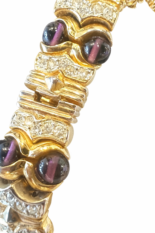 Vintage Gold Tone Purple Cabochon & Crystal Statement Necklace