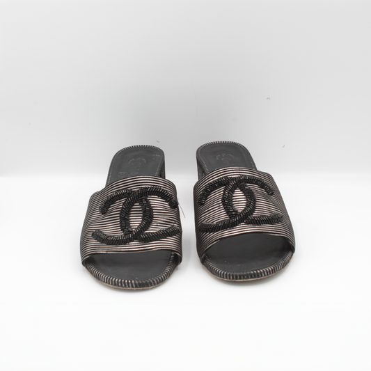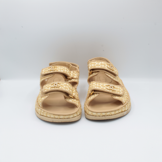 Chanel Beige Raffia Pearl Cc Logo Strap Flat Sandal Size 39