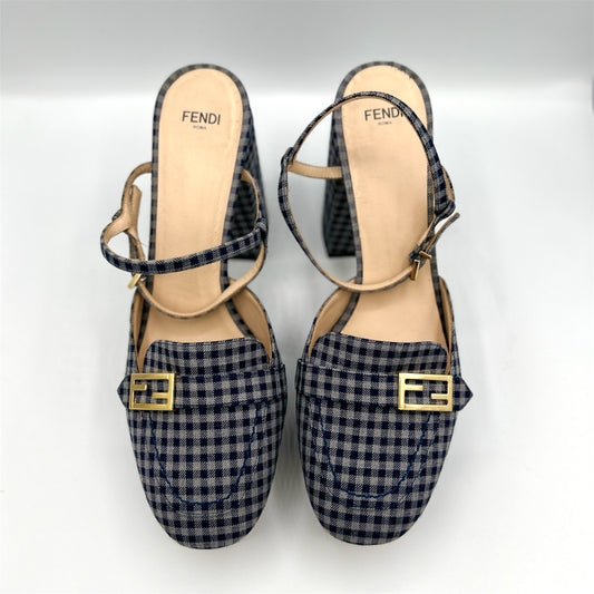 Fendi Promenade Blue Gingham Platform Block Heels Size 40.5