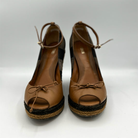 Fendi Espadrille Brown Leather & Canvas Wedged Open Toe Heels Size 38