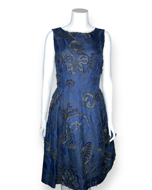 Oscar de la Renta Blue and Black Floral Pique Dress Size 4