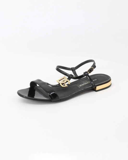 Dolce & Gabbana Black Polished Calfskin DG Plaque Sandals Size 41
