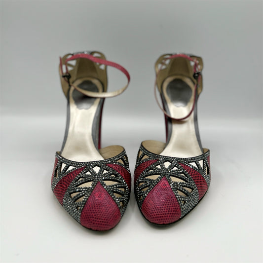 Rene Caovilla Pink Grey Crystal Lizard Skin Block Heel Size 38.5