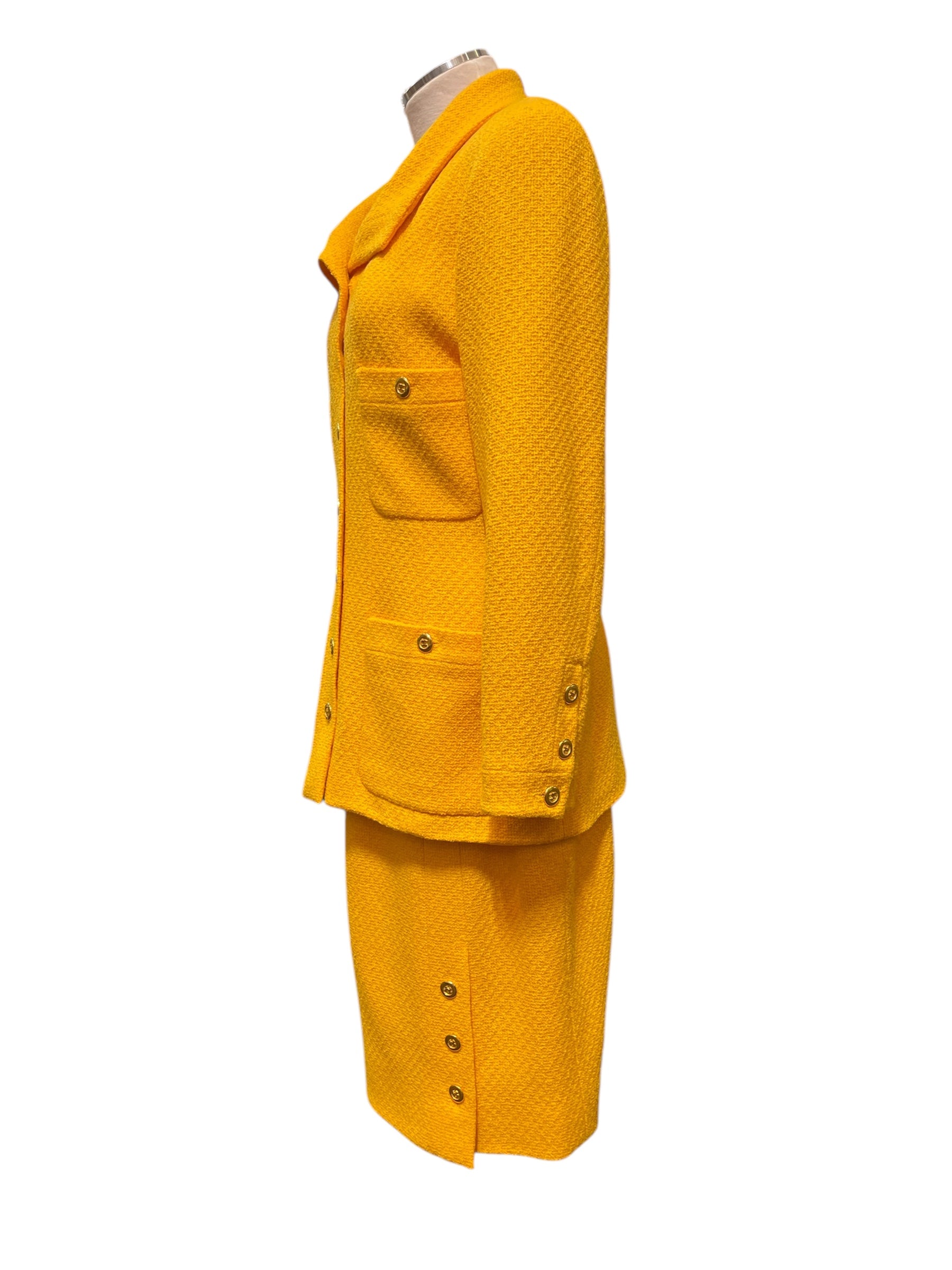 This Vintage Chanel Boutique Canary Yellow Tweed Skirt Suit Set Was Featured On 1989 Spring/Summer Runway Collection By Karl Lagerfeld. Made In France Tweed Set Lined In Yellow Silk With The “CC” Monogram Throughout. Both Skirt & Blazer Have “CC” Gold-Tone Metal Buttons, All Signed “CHANEL” On Back. Collared Jacket Has Signature Gold Chain Around Hemline. Jacket Is Secured With Seven Buttons, Three Buttons On Each Cuff. There Are Four Buttoned Pockets On The Face Of The Jacket & A 7” Vent On The Back With Three Buttons. The High Waisted Button Jacket Fastens At The Left Side With Concealed Zipper & Hook At Waistband. Three Buttons On The Front Left Side Can Open To 7.5” Slit. Suit Is In Excellent Condition.