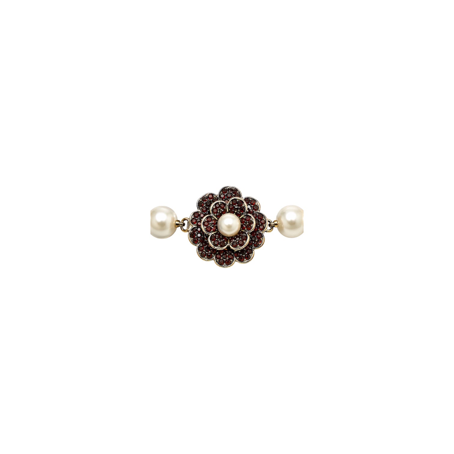 Strand Of 25 Faux Pearls With Soft Luster And Elegant Graduated Look Finished With Ornate Floral Clasp Featuring Red Rhinestones And Center Pearl Accent