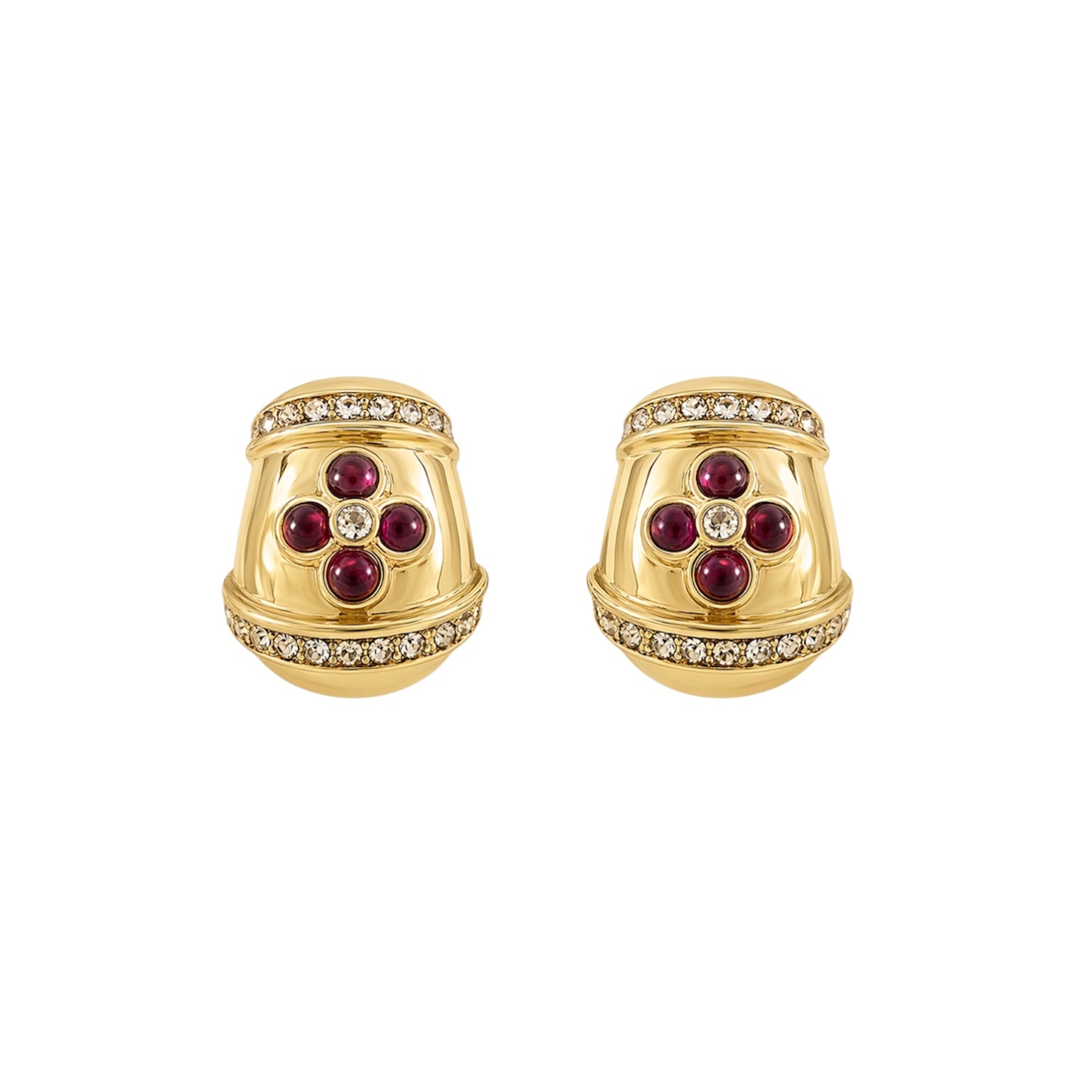 Rich, Sculptural Ciner Clip-On Earrings Featuring Deep Red Cabochon Stones Arranged In A Floral Motif, Framed By Sparkling Crystal Pavé And Polished Gold Tone Metal For A Bold, Luxurious Statement.
