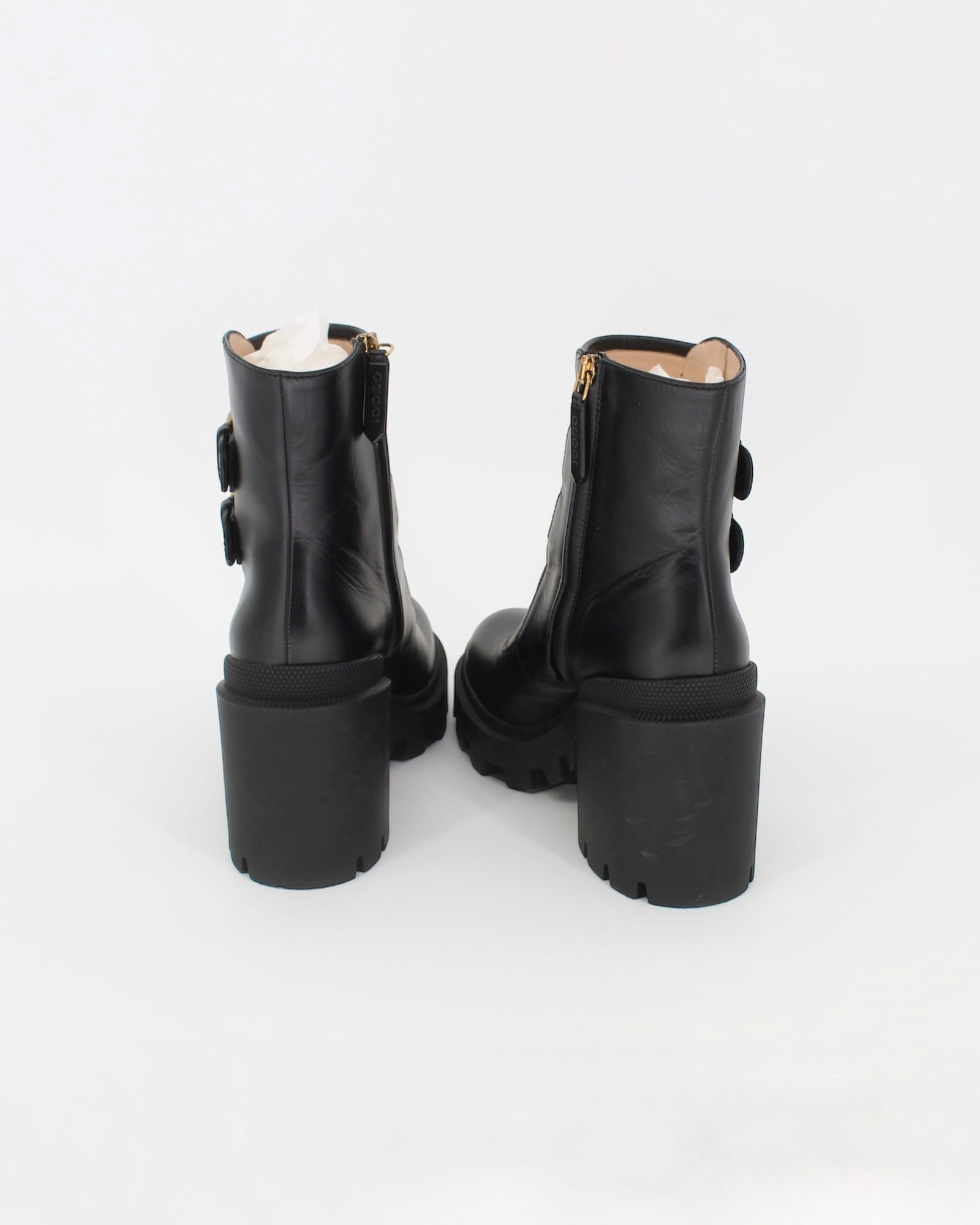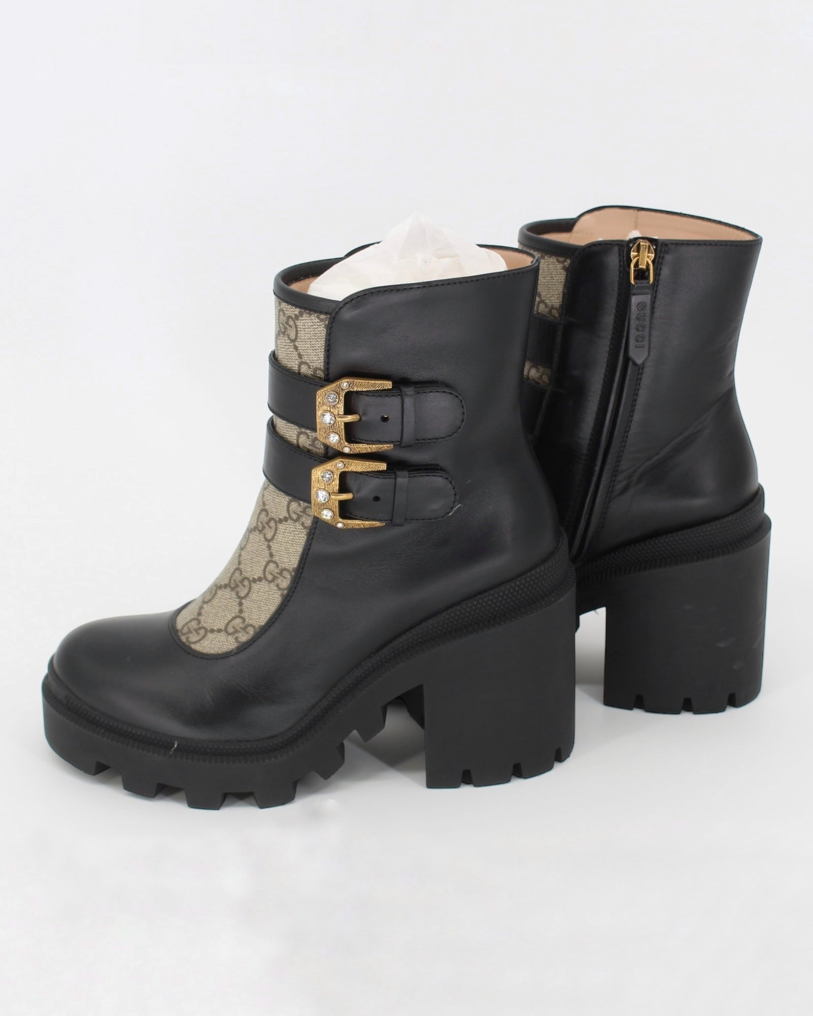Gucci Monogram Crystal Buckle Black Ankle Combat Heeled Boots Size 36