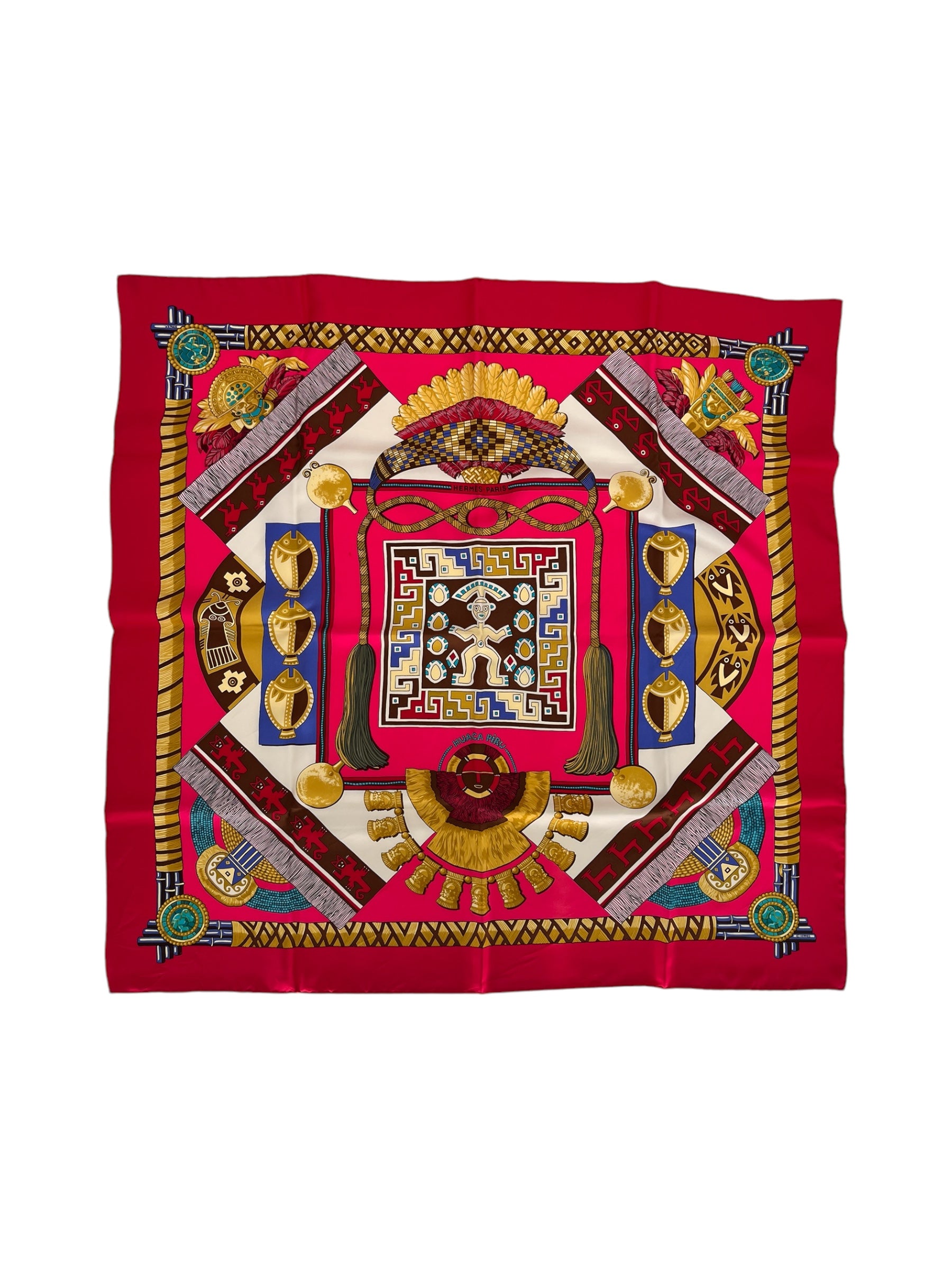 This Hermes "Huaca Piru" Silk Scarf By Sophie Koechlin In 2003 Features A Vibrant Design Inspired By The Huaca Piru, An Ancient Monument In Peru. The Scarfs Colorway Includes A Hot Pink Base With Multicolor Accents.