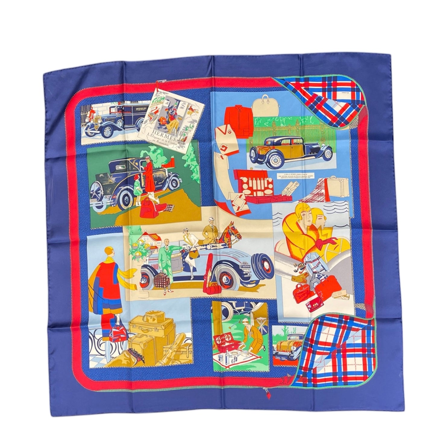 One Of A Kind Edition Hermès Silk Scarf Designed By Cathy Latham In 1996. The Scarf Features Art-Deco Style Images Of Leisure Travel And Picnics By Car. made Of 100% Silk. Color Palatte Of Yellows, Grays, Blues, Golds & Rosy Reds. Features A Multicolored Classic Car Motif.